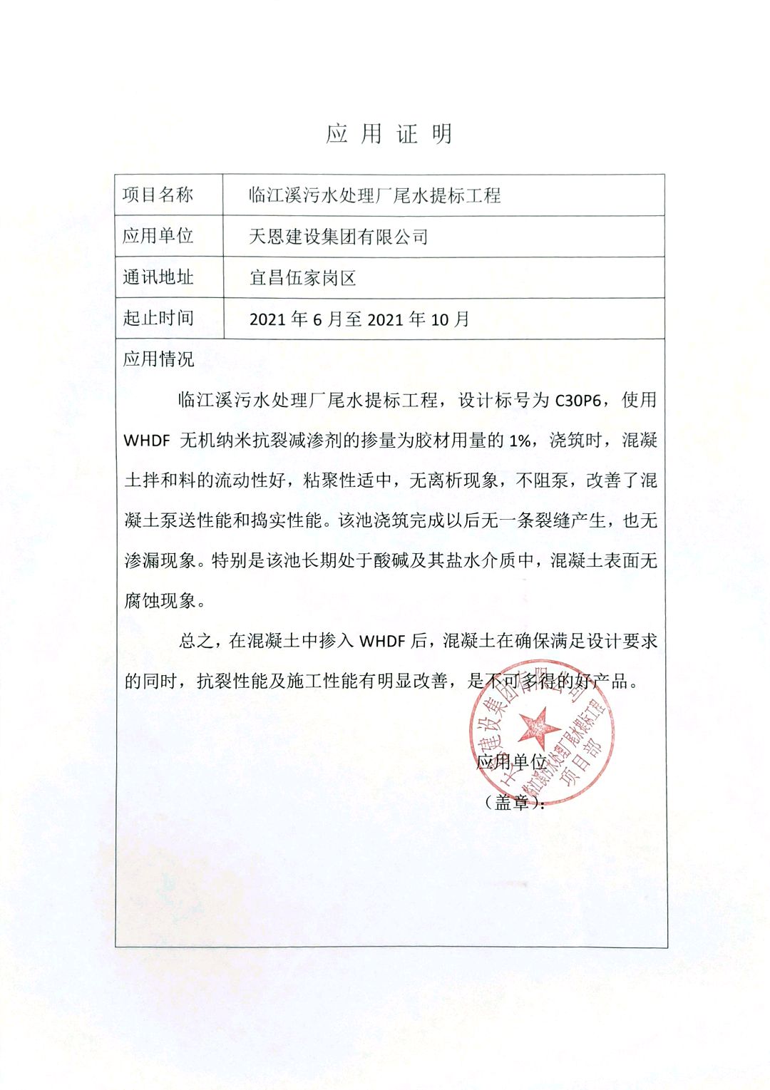 Application Certificate of Tail Water Treatment Project of Yichang Linjiangxi Sewage Treatment Works(2021)