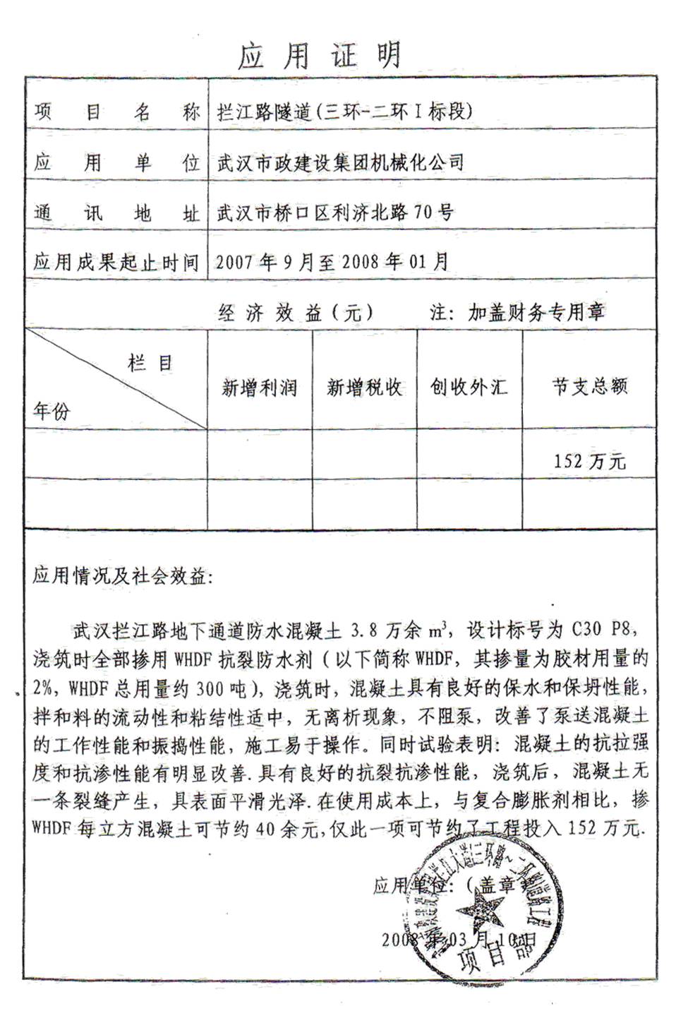 Application Certificate of Tunnel of Lanjiang Road(2007)